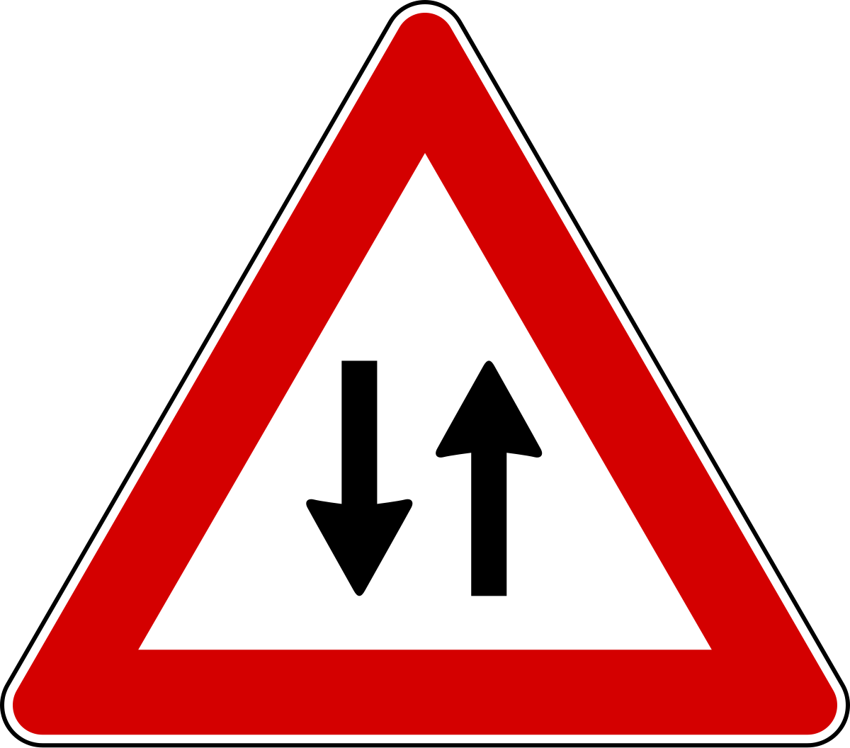 Segnale doppio senso di circolazione in alluminio o lamiera dimensioni lato triangolo 60 cm, 90 cm, 120 cm con disegno nero su sfondo bianco e bordo rosso. Fascia di prezzo: da € 23,38 a € 144,37 (IVA escl.)
